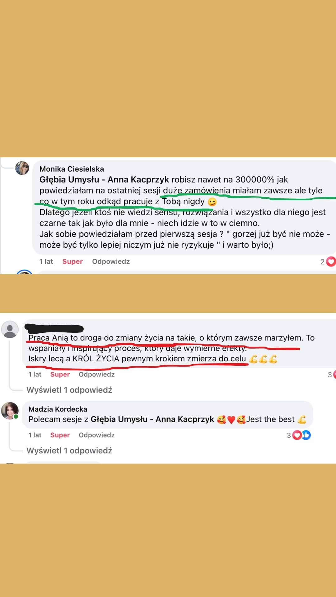 Anna Kacprzyk nie jest powiązane ani wspierane przez serwisy YouTube, Bing, Google ani Facebook. Żadna z tych platform (Google Inc., Microsoft Inc., Meta Inc.) nie zatwierdza naszej działalności. FACEBOOK to znak towarowy Facebook, Inc. YOUTUBE to znak towarowy Google, Inc. BING to znak towarowy Microsoft, Inc. Moc Dobrostanu Sp. z o.o. NIP: PL7262705082, REGON: 52855390200000, ul. Świtezianki 8/44, Łódź, 91-496, Łódzkie, Polska.
