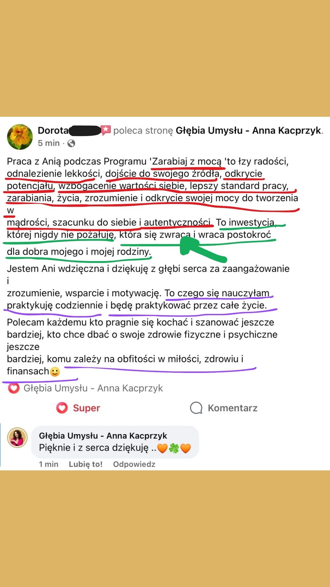 Anna Kacprzyk nie oferuje programów „szybkiego wzbogacania się”, okazji biznesowych ani systemów generowania dochodu.